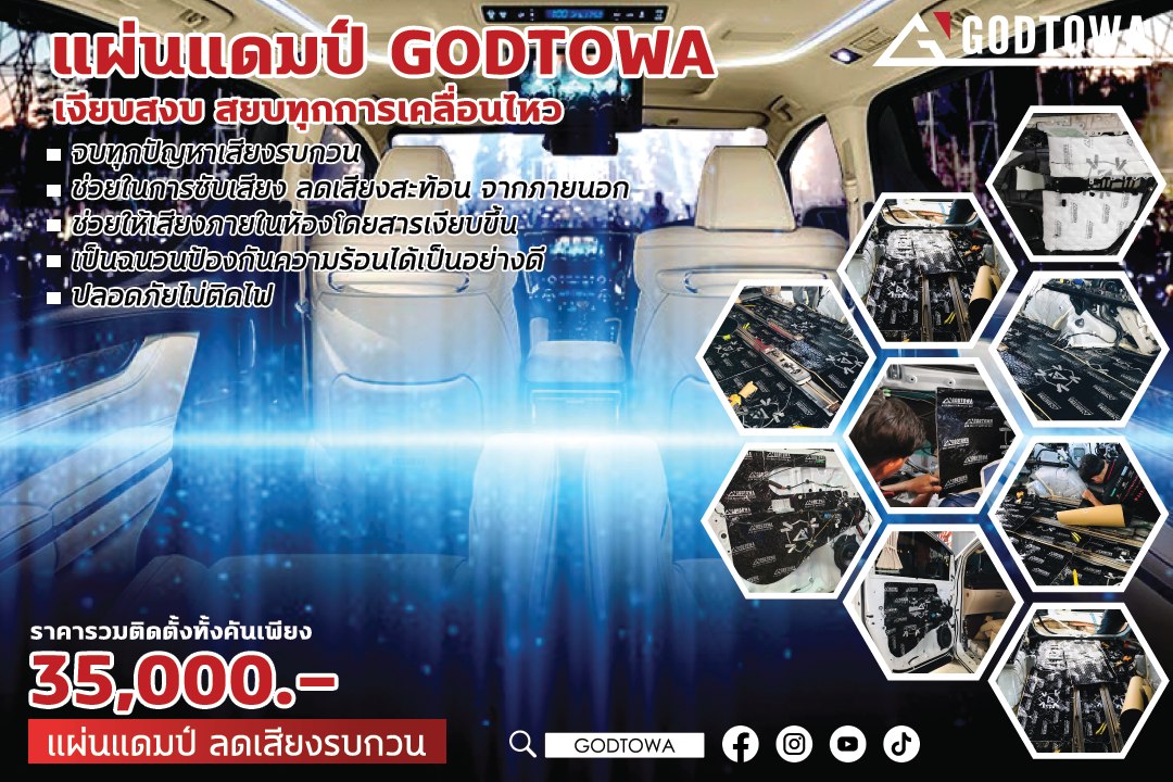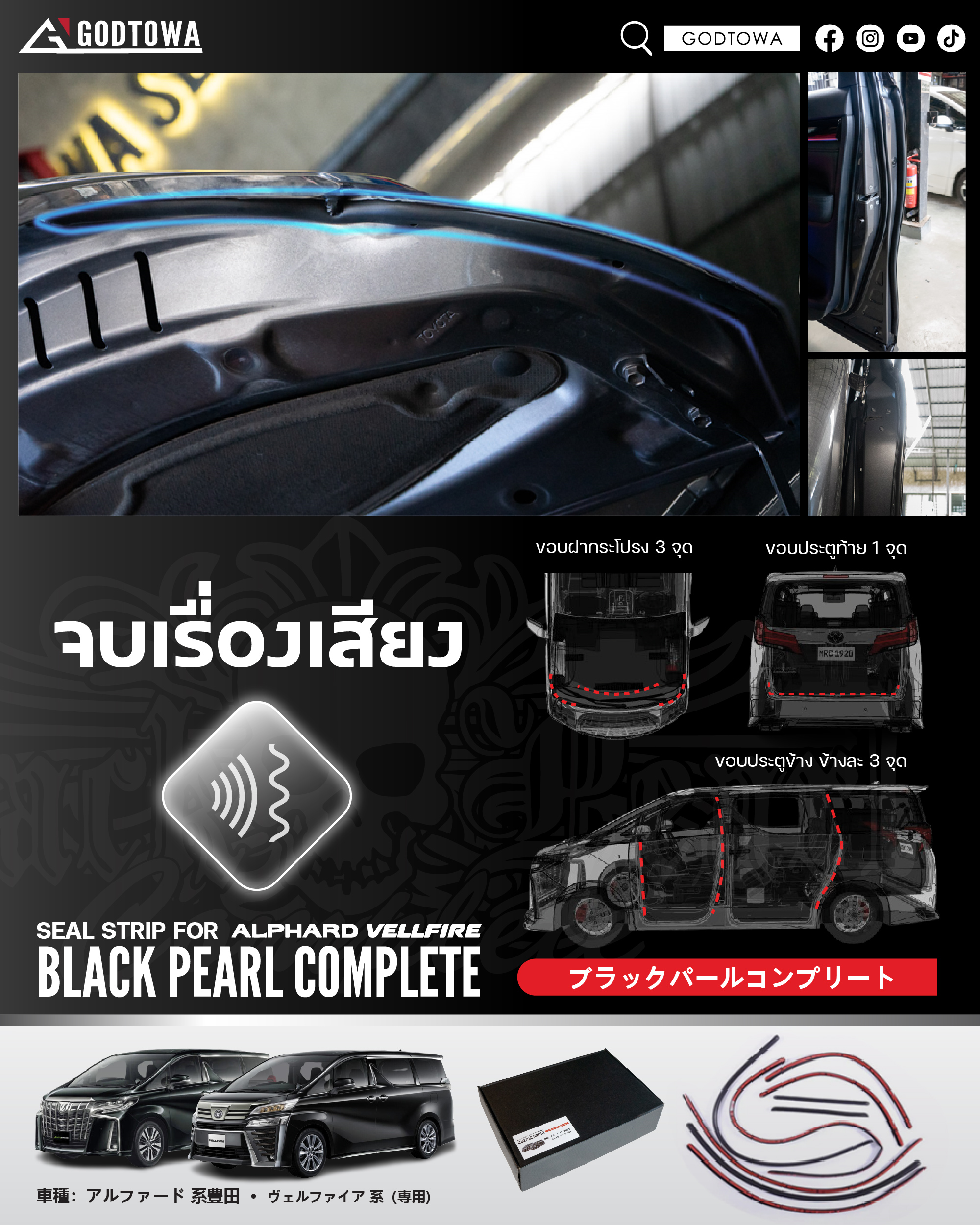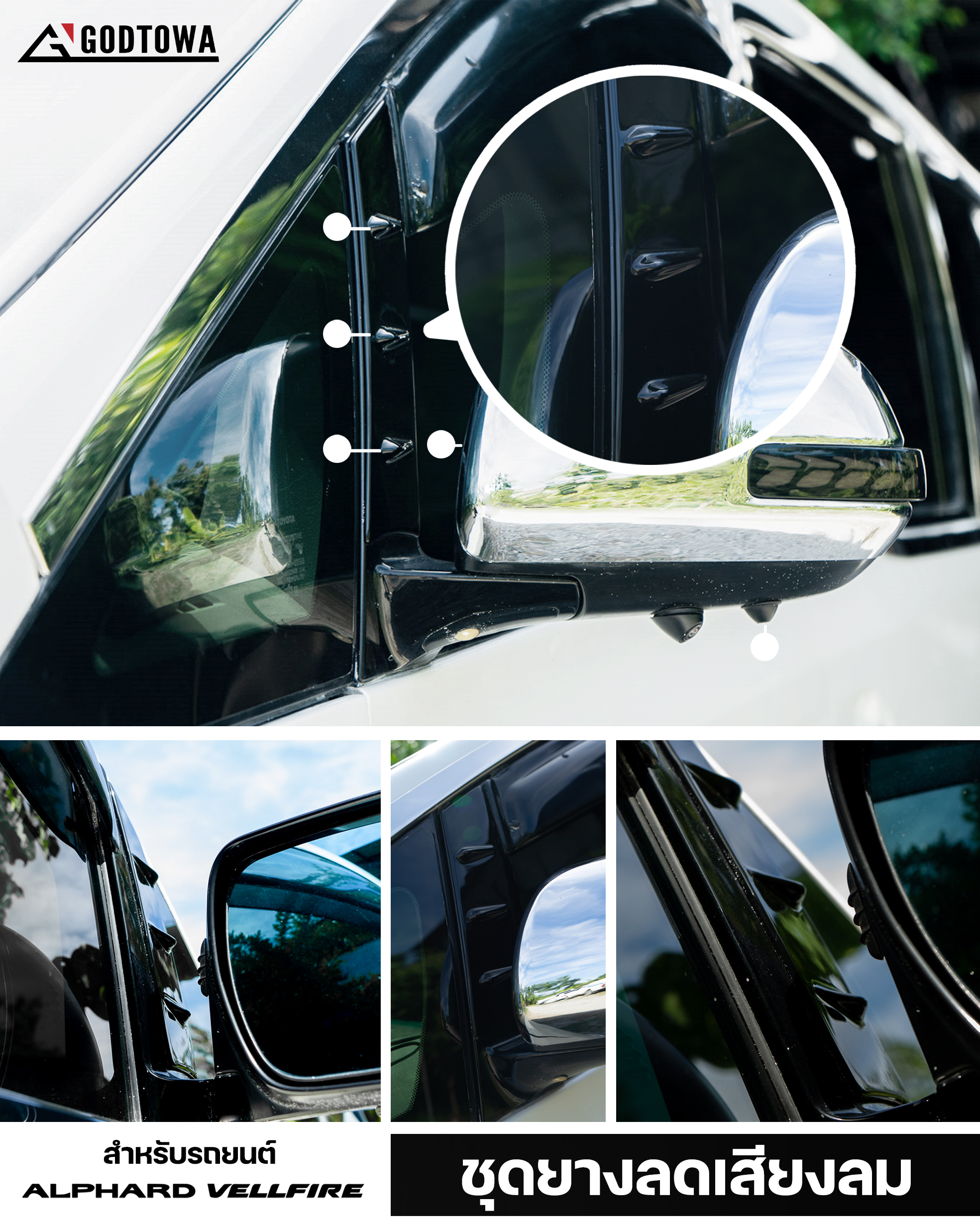 สำนักแต่ง GODTOWA ก็มีอุปกรณ์ช่วยลดเสียงรบกวนจากลมปะทะที่ทำงานโดยการใช้หลัก Aero Dynamics ในการทำงาน เมื่อขับขี่ด้วยความเร็วยางนี้จะช่วยลดการเกิดเสียงได้ดีในระดับที่น่าพึงพอใจ เราได้ผลตอบรับอย่างดีเยี่ยมจากลูกค้าที่ผ่านการใช้งานจริงมาแล้ว ว่าช่วยลดการปะทะของเสียงลมจากภายนอกช่วยให้ภายในห้องโดยสารเงียบขึ้น ลดลมที่เข้าทางช่องกระจกได้จริง เห็นผลจริงหลังติดตั้ง ที่สำคัญสามารถติดตั้งกับรถ ALPHAD / VELLFIRE ได้ทุกรุ่น