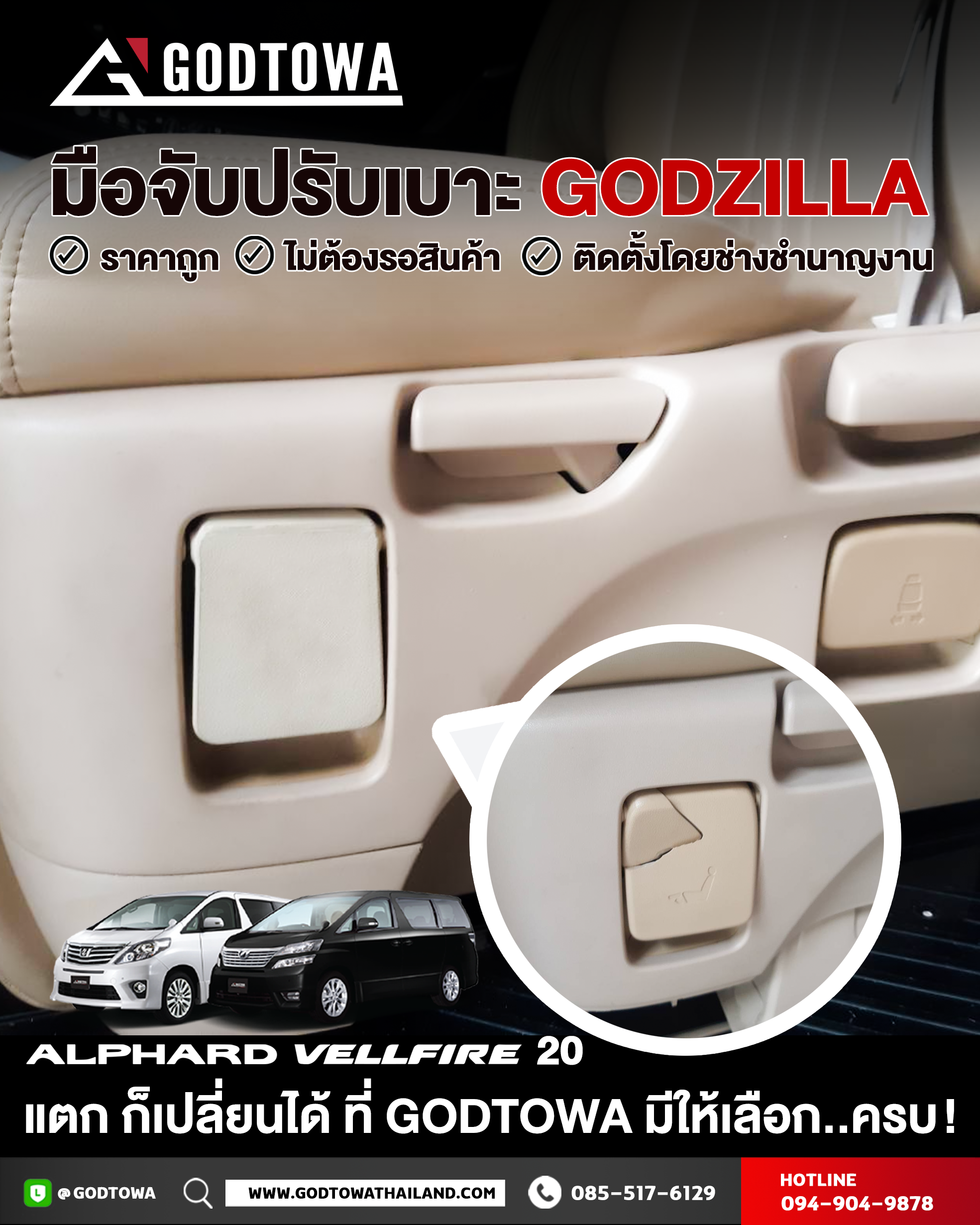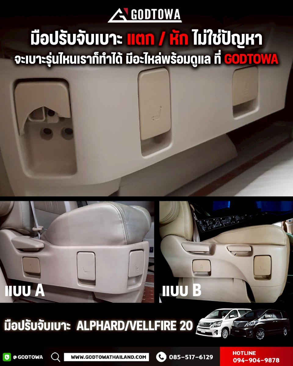 ที่ GODTOWA เรามีบริการ เปลี่ยน–ซ่อมมือปรับเบาะ สำหรับ ALPHARD/VELLFIRE 20 ครบทุกรุ่น พร้อมอะไหล่แทนที่มีคุณภาพ จบปัญหากวนใจได้ทันที