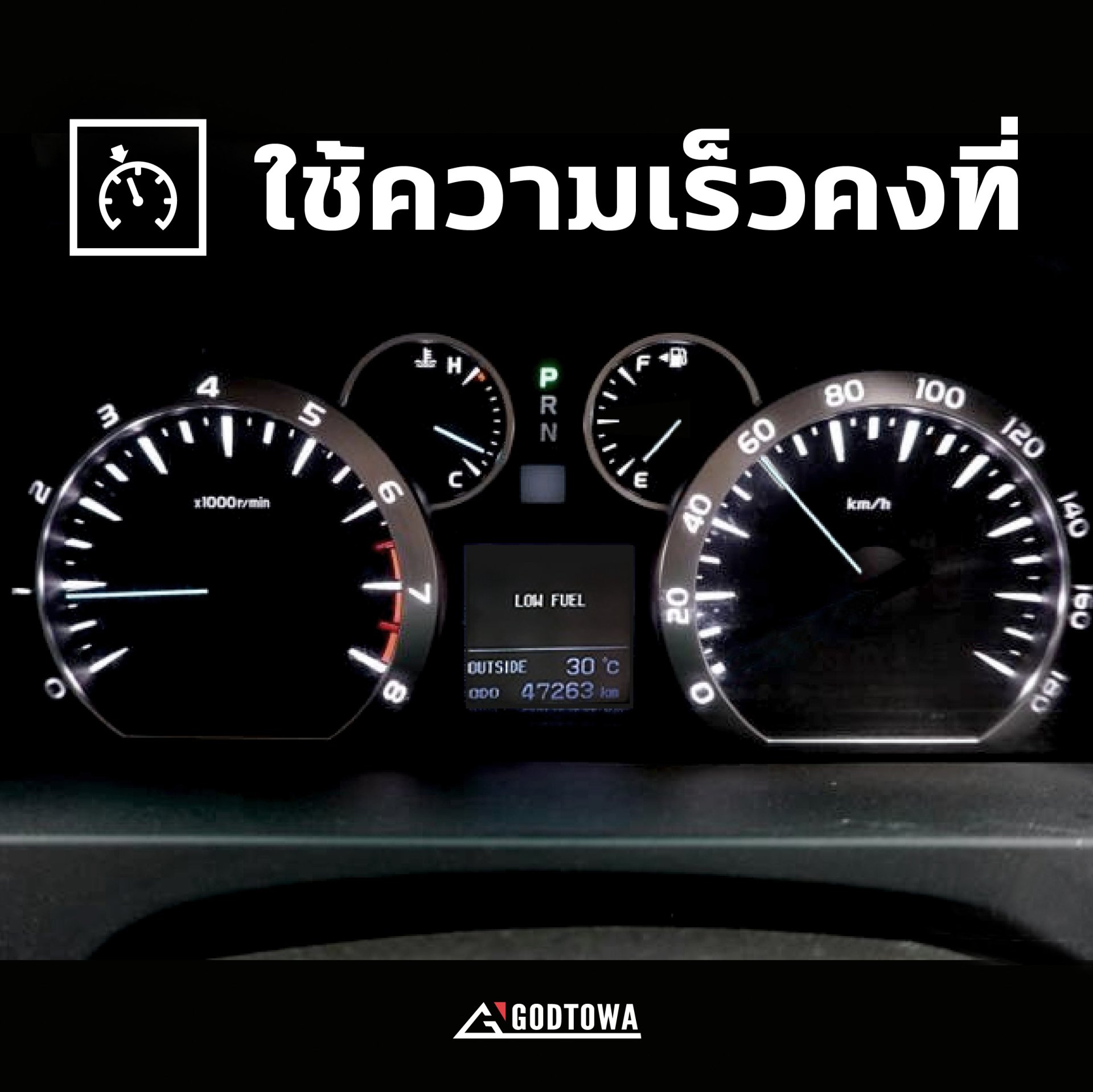 2. ควรใช้ความเร็วให้คงที่ อยู่ที่ 60-80 กม./ชม. ซึ่งการเร่งเครื่องนั้นต้องใช้พลังงานเชื้อเพลิงมากกว่าปกติ