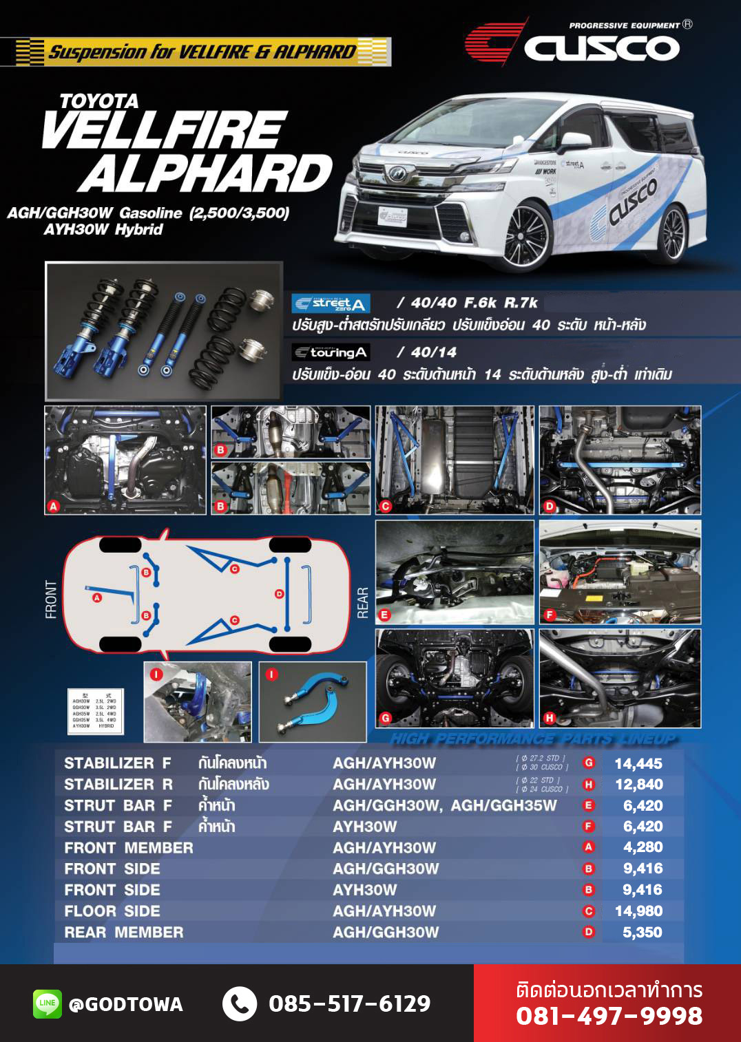ผลิตภัณฑ์ชุดช่วงล่าง CUSCO เต็มระบบ ไม่ว่าจะเป็นระบบกันสะเทือน กันโคลง รวมไปถึงค้ำตัวถัง กับรถ ALPHARD S C ปี 2021 "CUSCO" ผลิตภัณฑ์ช่วงล่างแบรนด์ชั้นนำจากประเทศญี่ปุ่นสำหรับรถ ALPHARD / VELLFIRE ที่จะมาช่วยในเรื่องการทรงตัวของรถขณะขับขี่ ให้คุณสมบัติ ลดการบิดตัวของตัวถัง ลดอาการโคลงเคลง ให้ผู้ขับขี่สามารถควบคุมรถได้อย่างกระชับ เต็มสมรรถนะมากยิ่งขึ้น สนใจรายละเอียดเพิ่มเติมสามารถสอบถามได้ที่สำนักแต่ง GODTOWA