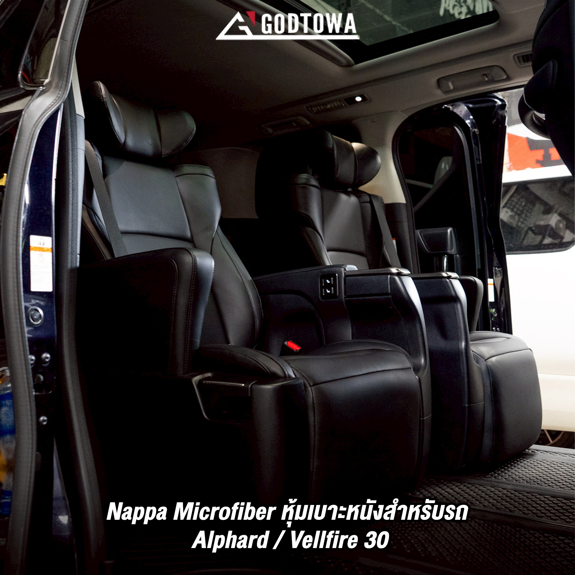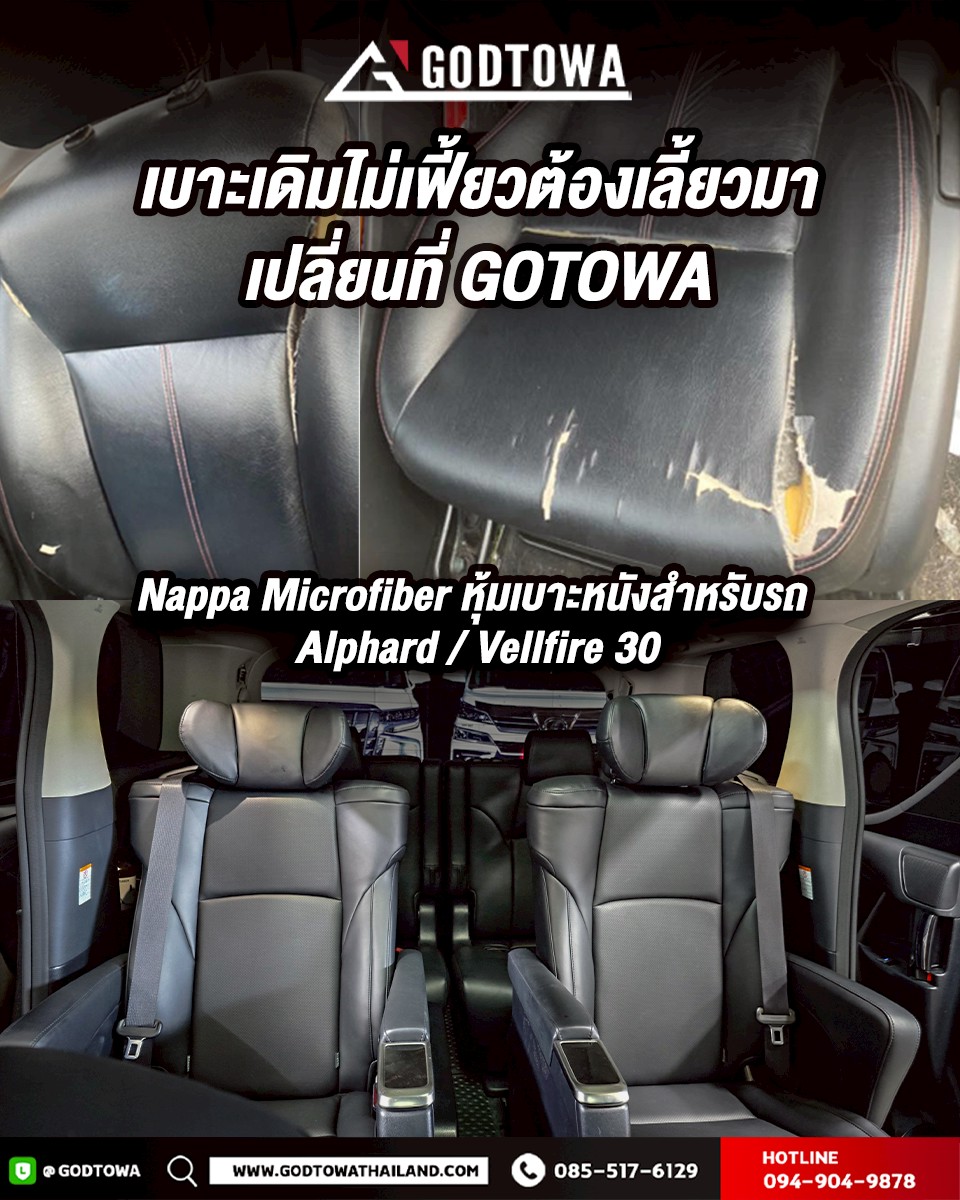 สำหรับหนังไมโครไฟเบอร์ที่สำนักแต่ง Godtowa ของเรานำมาหุ้มเบาะ Alphard/Vellfire นั้นเป็นชนิดพิเศษ เกรด Nappa ซึ่งเป็นลิขสิทธ์ในการผลิตเบาะรถยนต์ ของ Mercedes-Benz จึงทำให้ภายในห้องโดยสาร Alphard/Vellfire ของเรา มีสัมผัสนุ่มสบายเสมือนนั่งโดยสารบน Mercedes-Benz เพิ่มเติมขึ้นมาตรงความทนทาน และ ดูแลรักษาง่าย