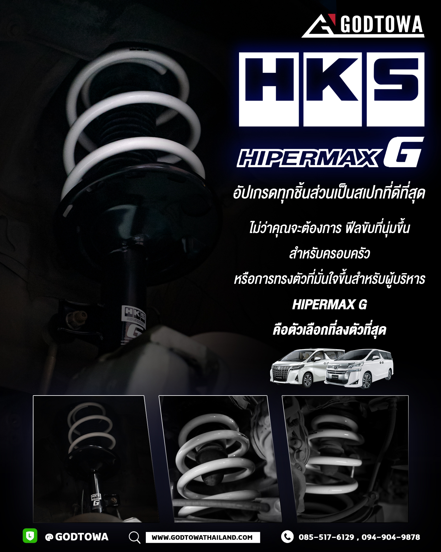 HKS HIPERMAX G ใช้วัสดุโครงสร้างที่มีความแข็งแรงสูง เพื่อมาลดปัญหาอาการส่ายของรถตู้ที่มีน้ำหนักค่อนข้างสูงอย่างรถ ALPHARD / VELLFIRE ได้อย่างมีประสิทธิภาพ เพิ่มความนุ่มนวลในการขับขี่บนถนนที่มีสภาพขรุขระ และให้สมรรถนะการทรงตัวที่ดีกว่าเมื่อขับรถด้วยความเร็วสูง