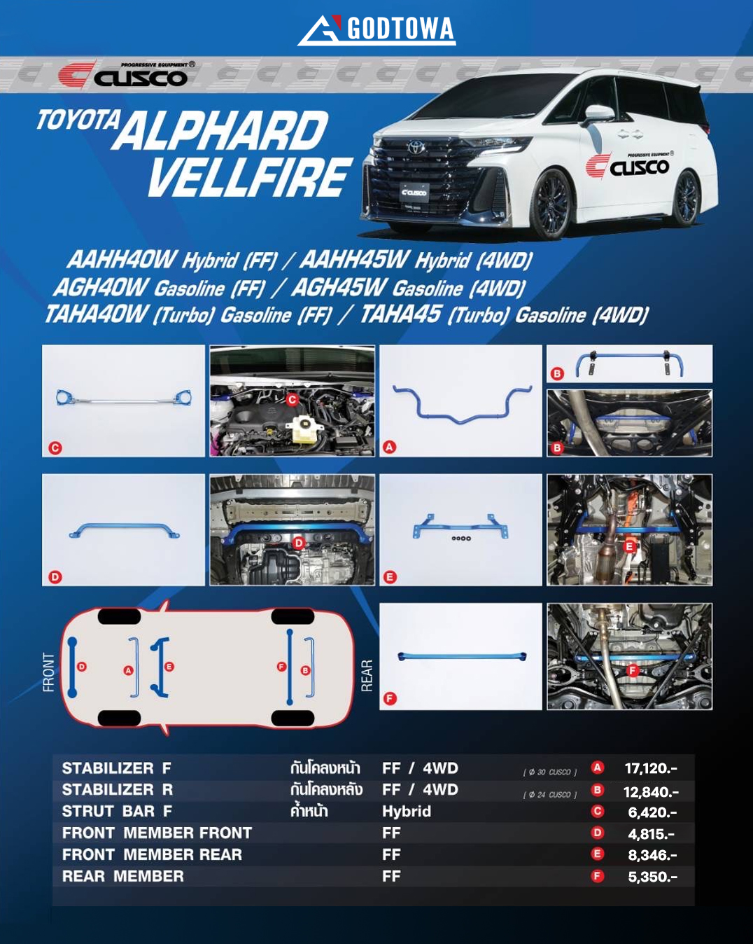 ผลิตภัณฑ์ Cusco สำหรับ Toyota Alphard/Vellfire 40 ซึ่งมีรายละเอียดผลิตภัณฑ์แจ้งตัวแทน ดังนี