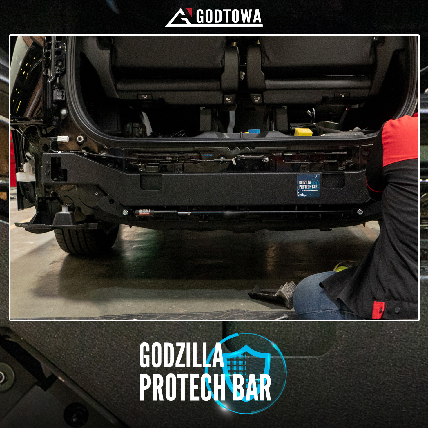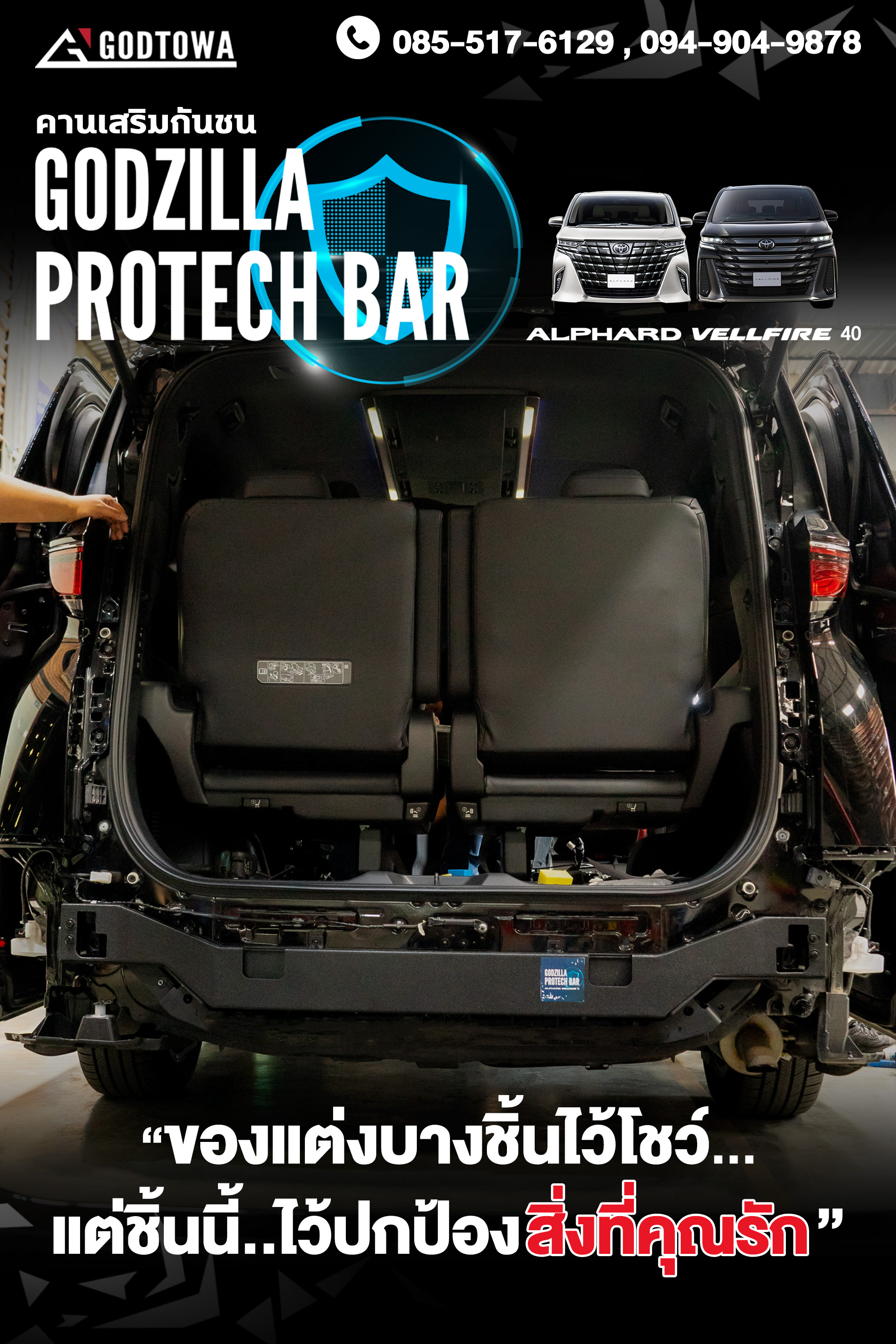 คานเสริมGODZILLA PROTECH BAR บาร์กันชนหลัง (Rear Bumper Guard Bar) สำหรับ Toyota Alphard และ Toyota Vellfire รุ่นที่ 40 เพื่อปกป้องพื้นที่ปะทะ ช่วยลดความเสียหายให้เกิดขึ้นกับตัวรถและเพิ่มพื้นที่การรับแรงหรือความเสียหายจากคานเดิมให้กว้างมากขึ้น ช่วยลดความเสียหายที่จะกระทบเข้าสู่ตัวรถโดยตรงได้ เป็นที่นิยมในการตกแต่งรถยนต์ยี่ห้อนี้ในปัจจุบัน