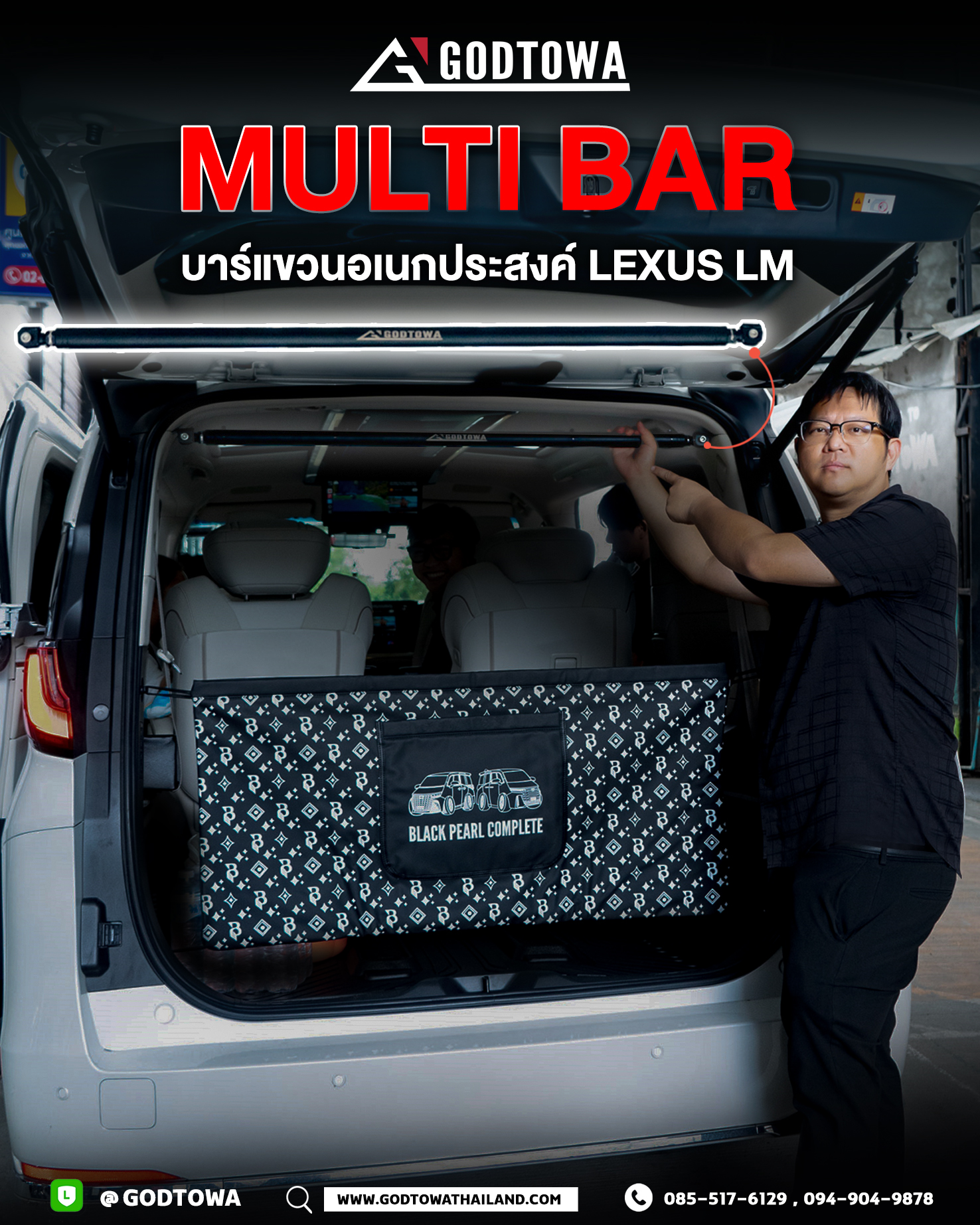 MULTI BAR สำหรับ LEXUS LM คืออุปกรณ์เสริมภายในรถที่ออกแบบมาเพื่อช่วยเพิ่มฟังก์ชันการใช้งานในพื้นที่ส่วนท้ายรถ โดยสามารถใช้แขวนกระเป๋า เสื้อผ้า หรืออุปกรณ์ต่างๆ ให้เก็บเป็นสัดส่วน ดูเรียบร้อย และใช้งานได้สะดวกมากขึ้น โดยยังคงความหรูหราและความเป็น Premium ของ LEXUS LM ไว้อย่างครบถ้วน